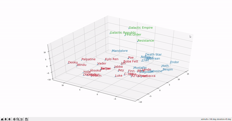 Continuing the Star Wars theme, this GIF (source) shows the distribution of Star Wars word embeddings. Words of the same type (characters, places, organizations) are clustered together.